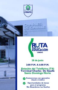 Centros APEC de Educación a Distancia (CENAPEC) realizará el próximo viernes 28 de junio de 2:00 p.m. a 6:00 p.m., el relanzamiento del proyecto la “Ruta por la Educación”. El escenario del evento será la Estación Charles de Gaulle (T4) del Teleférico de Santo Domingo, ubicada en Santo Domingo Norte.