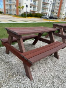 “Nosotros hacemos un perfil de plástico reciclado que es una madera plástica, y con eso hacemos mobiliario urbano como bancos, sillas, mesas, parques infantiles y la meta a largo plazo es hacer viviendas”